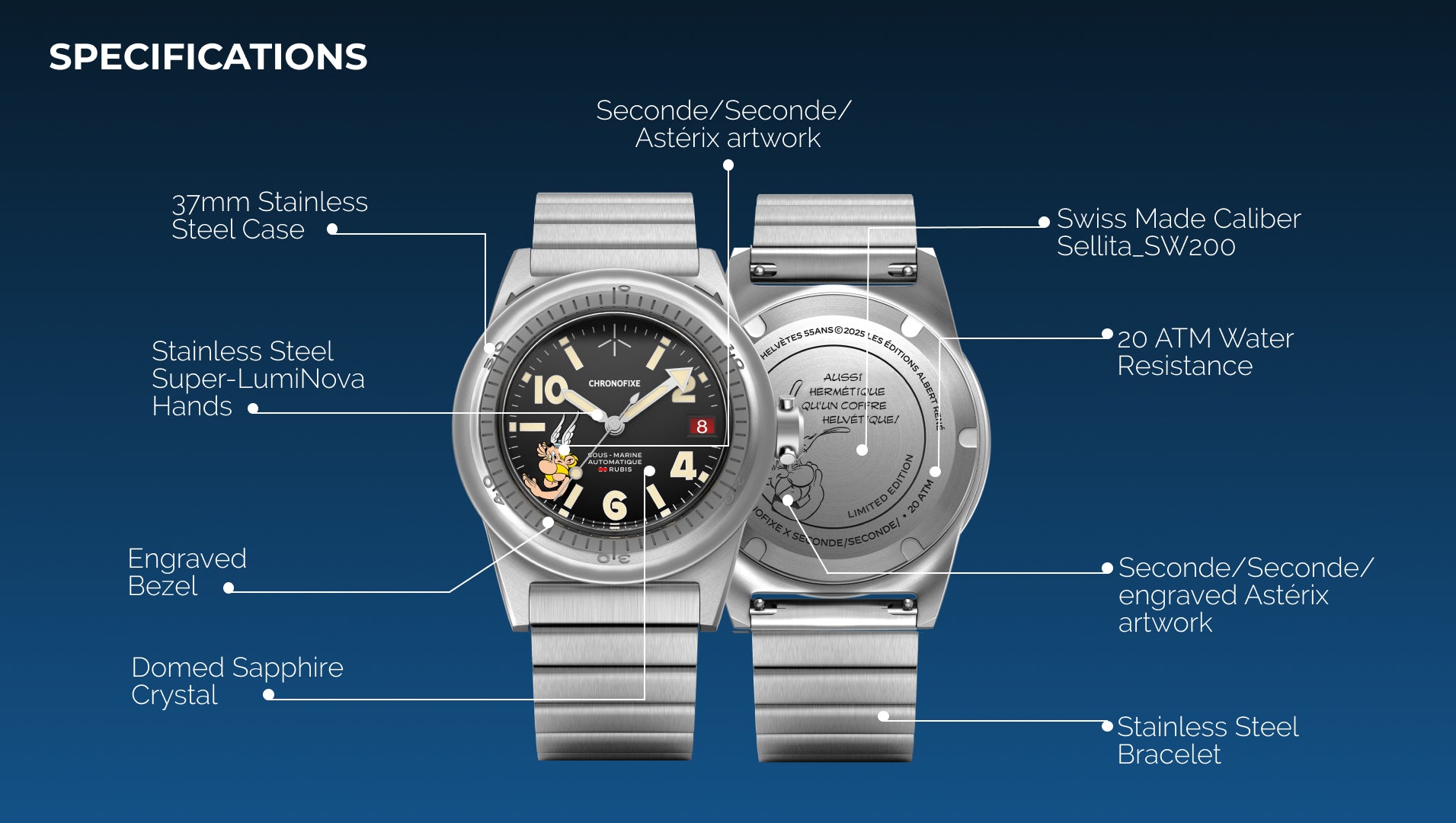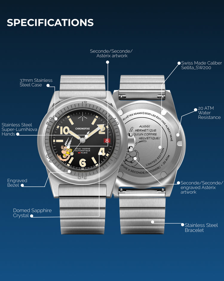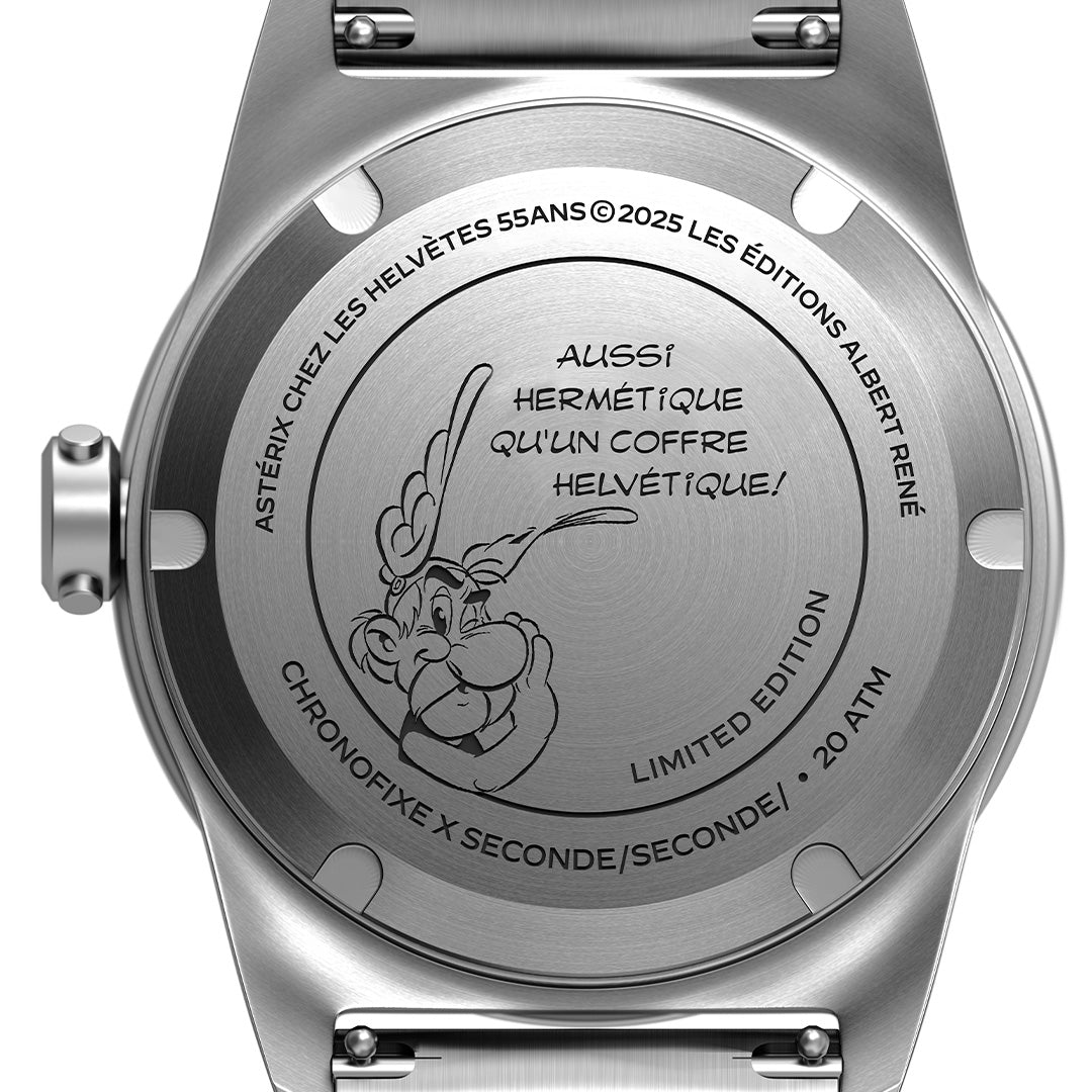 From the dial to the engraving on the caseback, every detail plays into the Astérix theme: subtle, ironic, and unmistakably Seconde/Seconde/.
