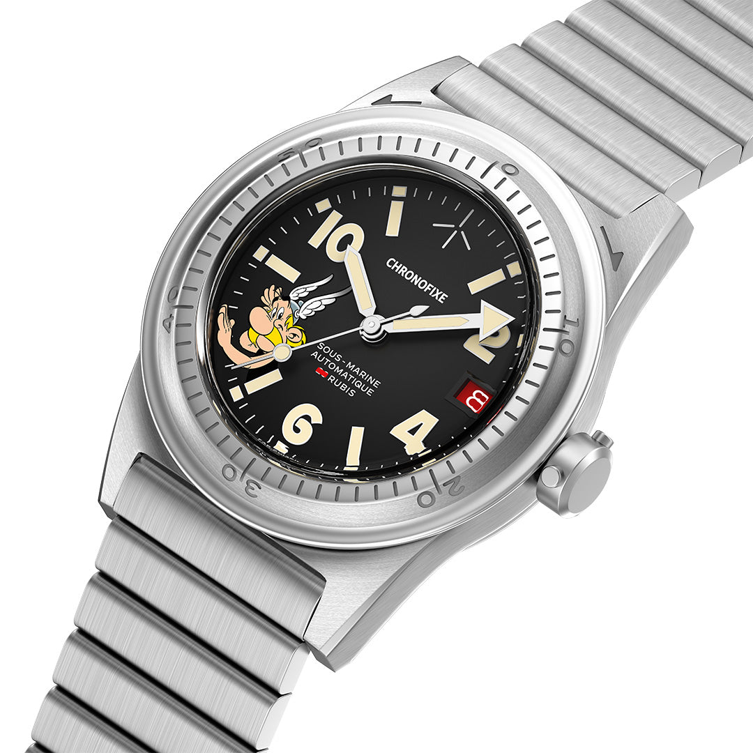 Designed by Seconde/Seconde/, this Swiss Made limited edition stages Astérix in full infiltration mode: ear pressed to the dial, fingers working the bezel like a vault code. From the bidirectional bezel styled as a combination wheel to the crown shaped like a locking handle, every detail plays into the Swiss banking fantasy.