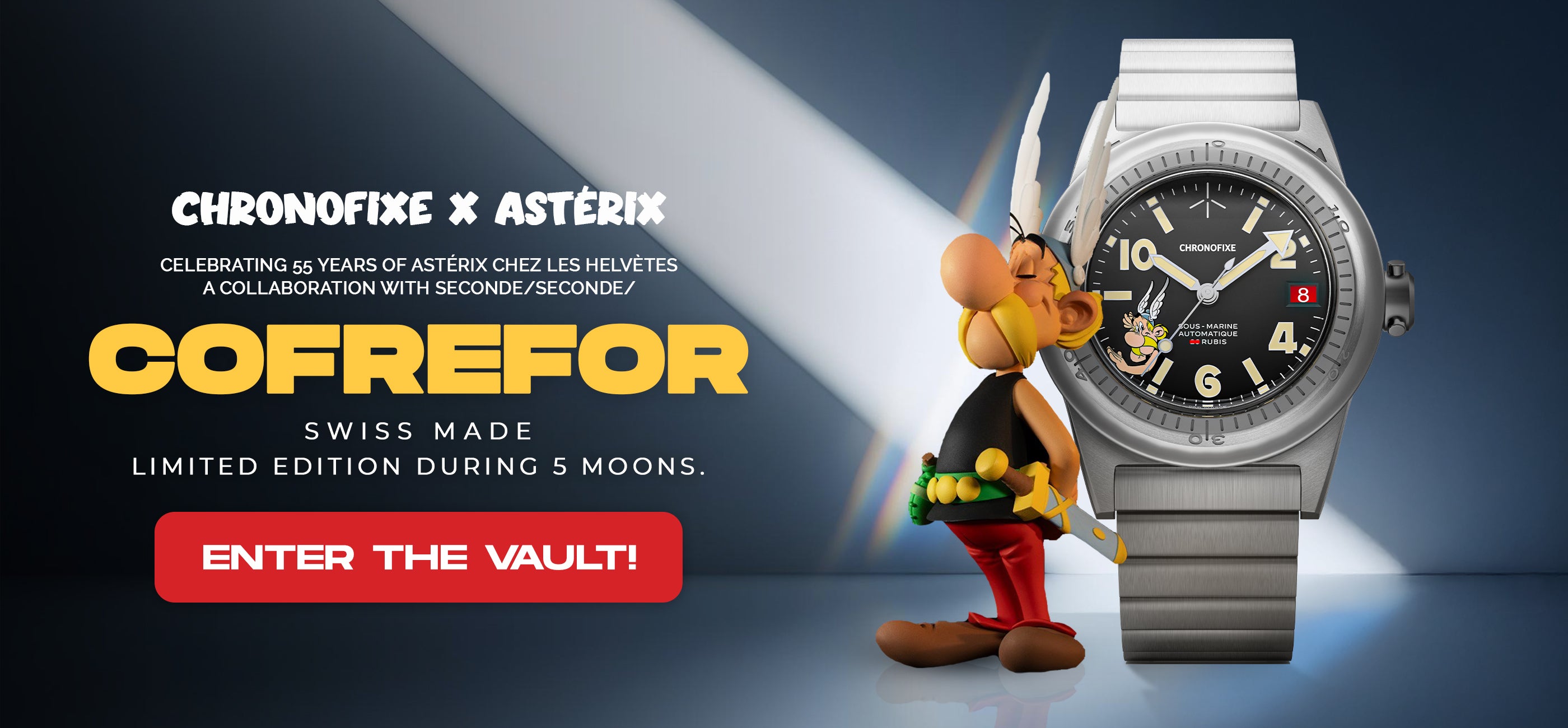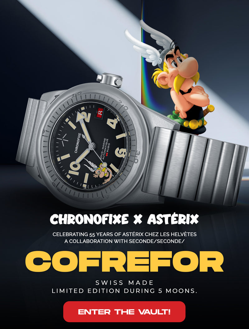 After decades, Chronofixe reconnects with its legacy through a bold collaboration with Romaric André (Seconde/Seconde/). Inspired by the world of Asterix, this 500-piece limited edition blends 1960s vintage charm with playful creative twists. From Roman numerals to a laurel-engraved crown, every detail celebrates boldness and imagination—a true tribute to timeless adventure and craftsmanship.